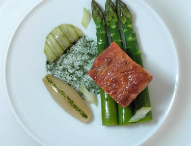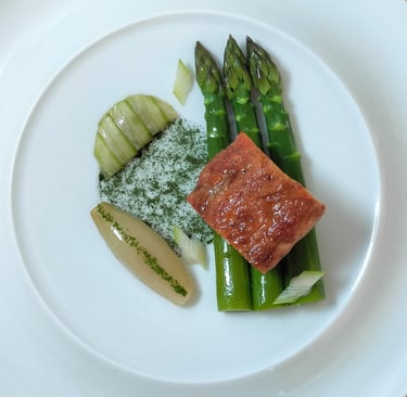 Pintade contisée au beurre de népita, asperges et jus d'herbes fumé : comme une invitation à la promenade entre maquis et jardin.