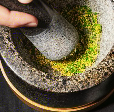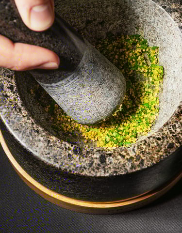 Mortier avec graines de moutarde, livèche de production locale : parfait pour accompagner un morceau de turbot confit dans une huile de persil.